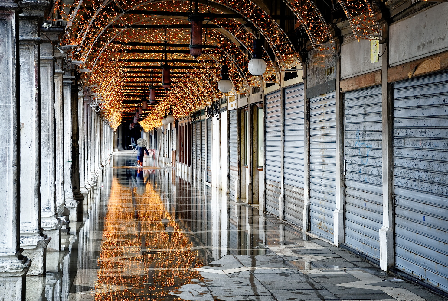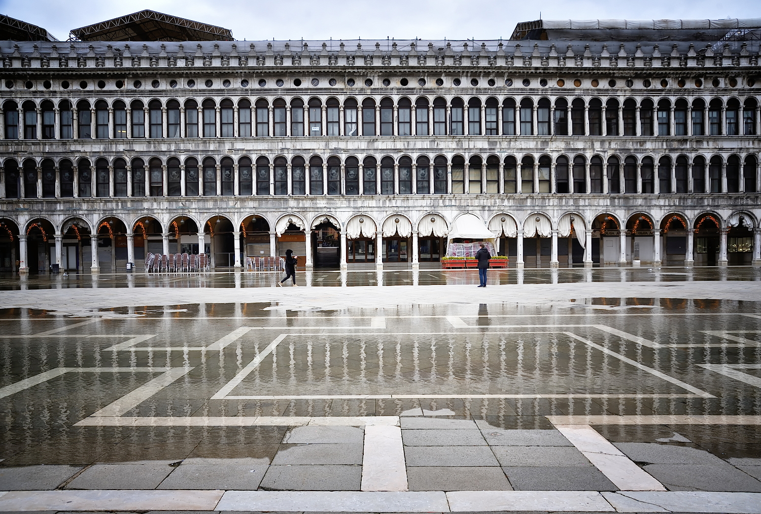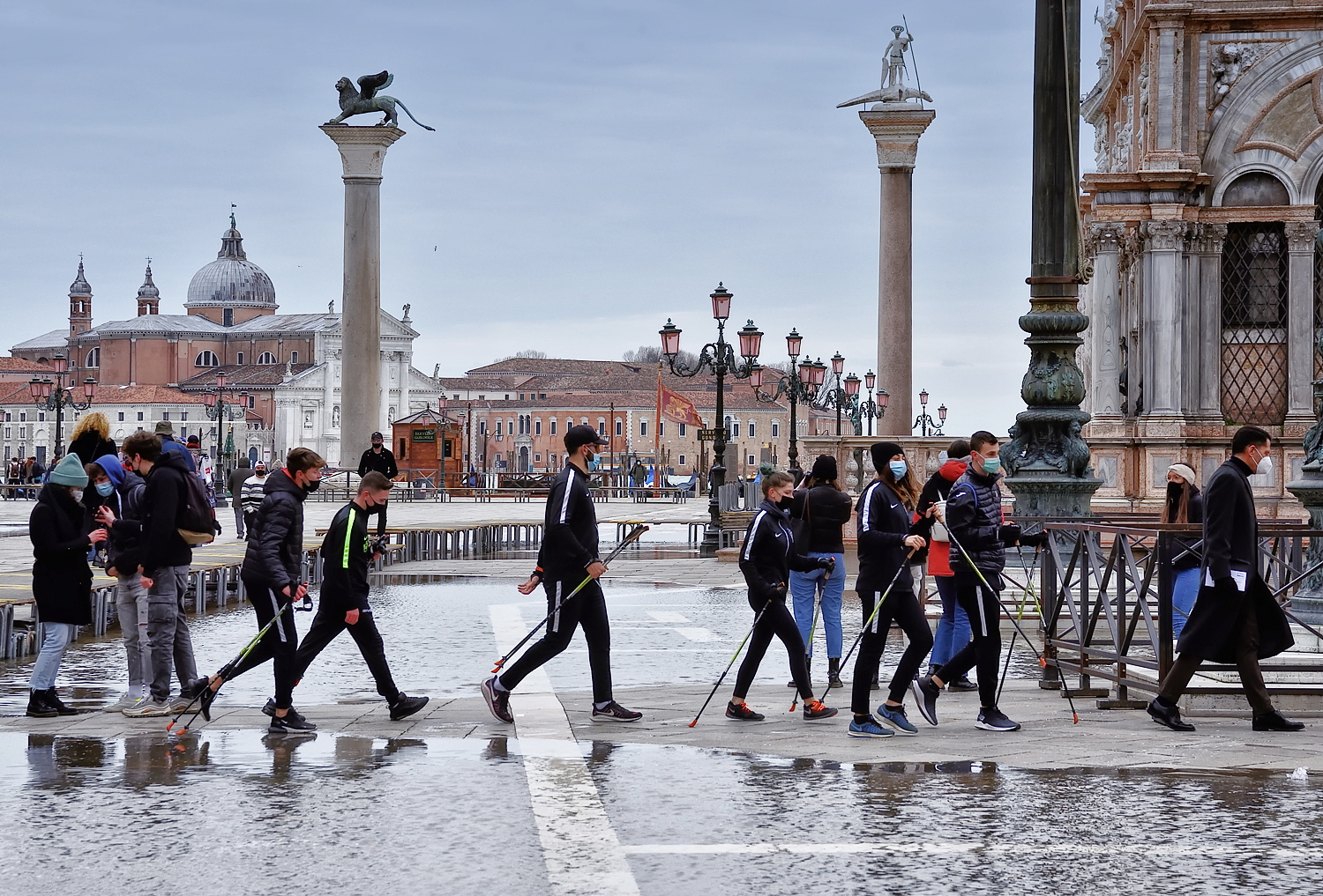 La leggera acqua alta, dovuta ad una normale marea, non fa che da significante alla città. Veneziani, l’augurio è di ripartire tutti il prima possibile.