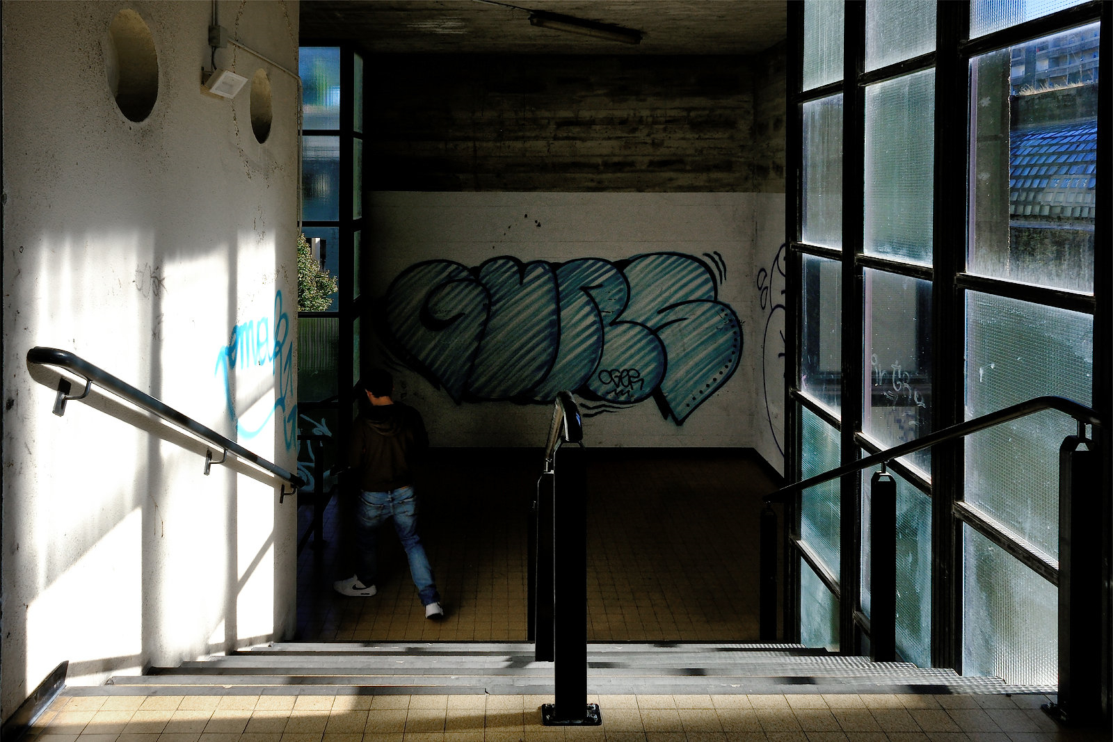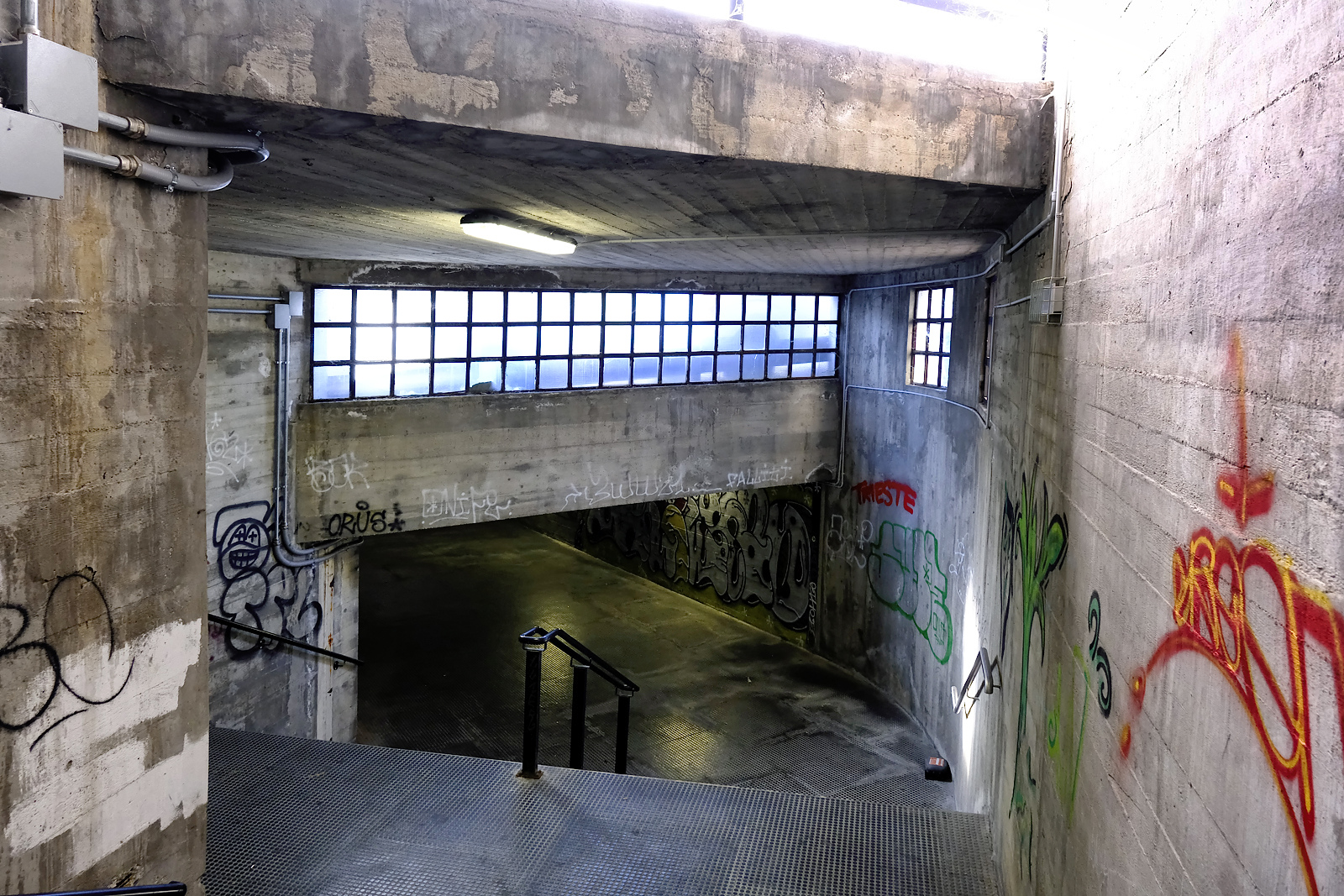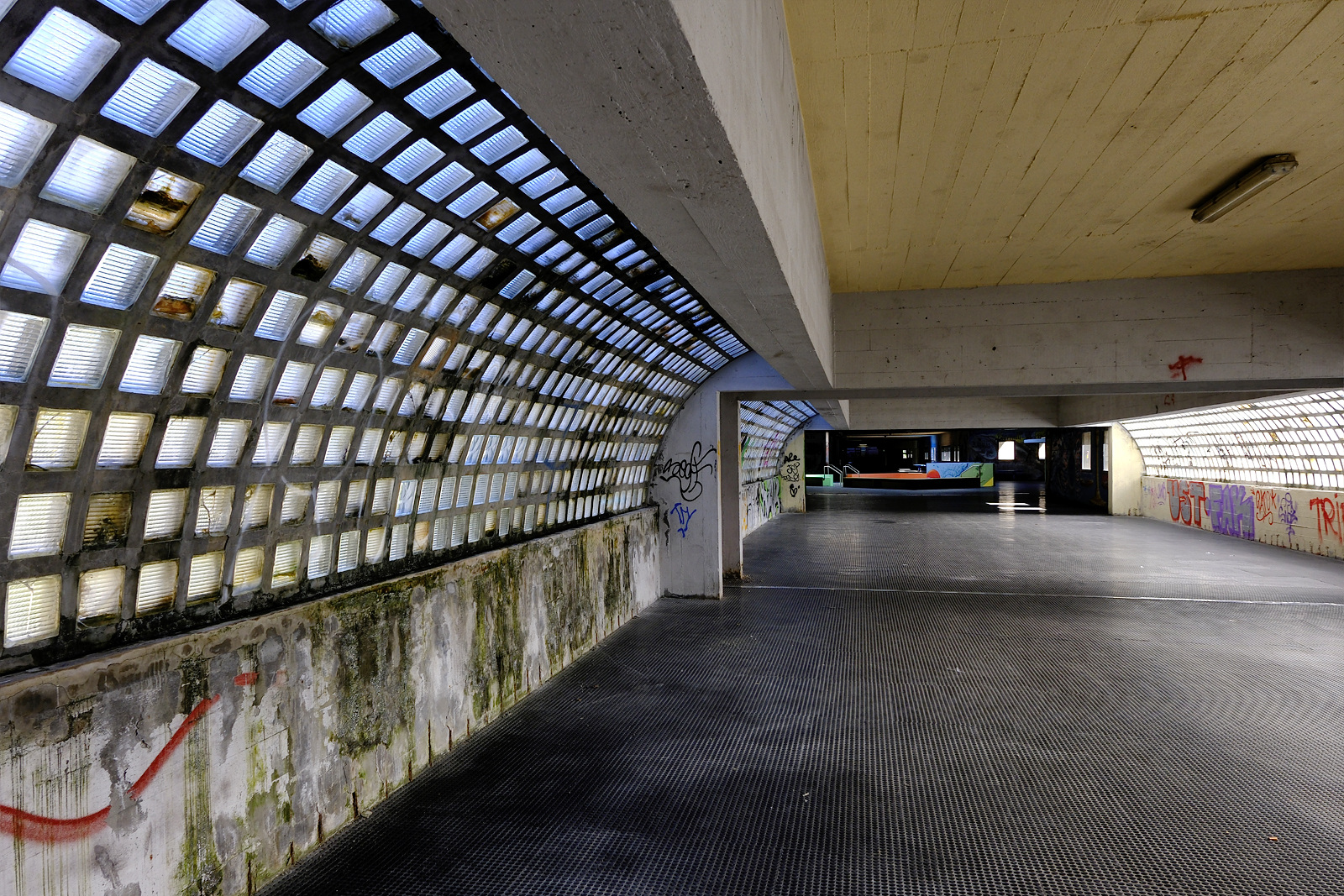I progettisti si sono dimenticati di cosa significa camminare per centinaia di metri in corridoi semibui, illuminati da squarci di sole, poi dipinti da graffiti e murales.