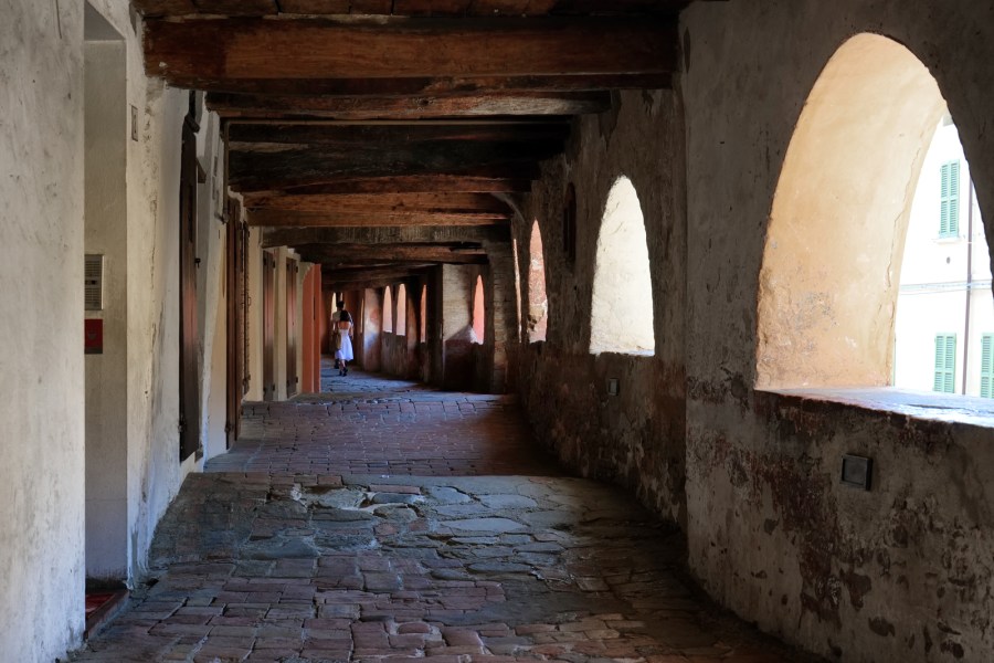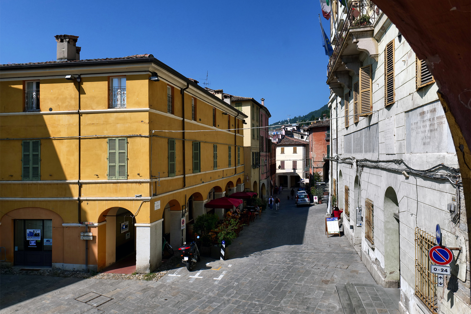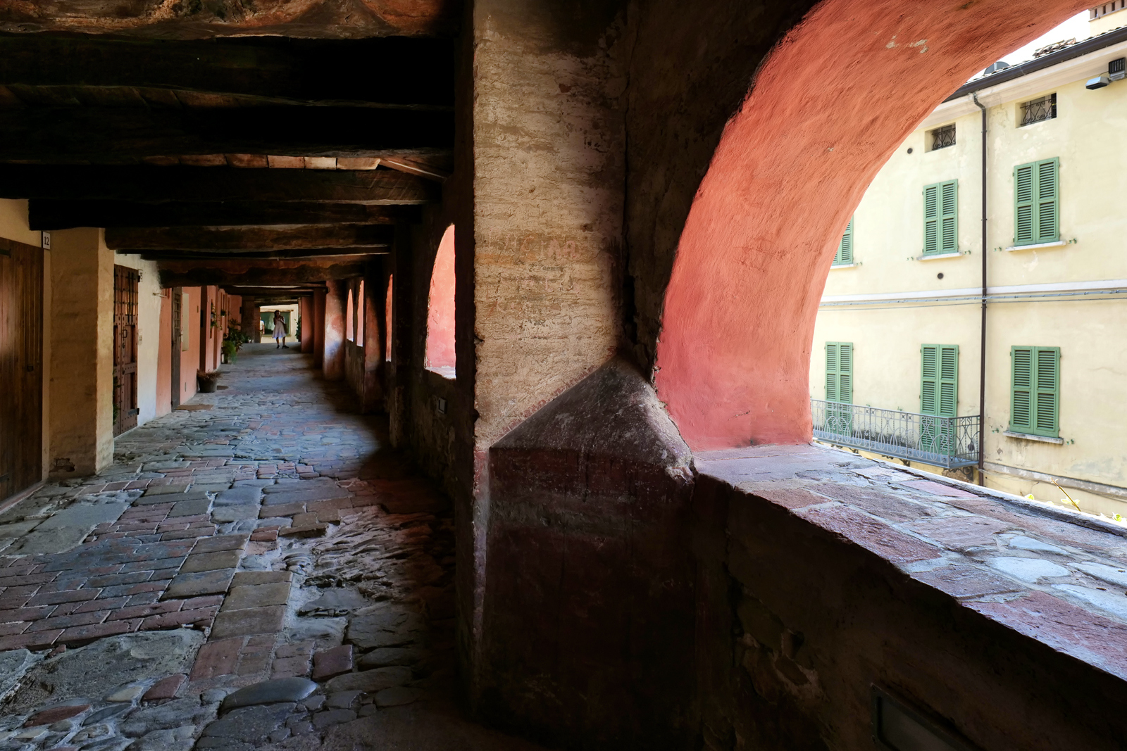 La via del Borgo, nota anche con il nome di via degli Asini, è una suggestiva strada sopraelevata, quasi interamente coperta da archi di ampiezze differenti. Anticamente poggiata su una larga base di roccia, rivestiva un’importante funzione difensiva, attestata dalla presenza di una compatta fila di case a protezione del lato sud del borgo. Solo in un secondo tempo lo zoccolo fu scavato per ricavarne stalle, fondaci e negozi, trasformando così il portico in una sopraelevata. Il nome di via degli Asini deriva dall’uso di far passare per la via le carovane di animali adibiti al trasporto del materiale dalle vicine cave di gesso.