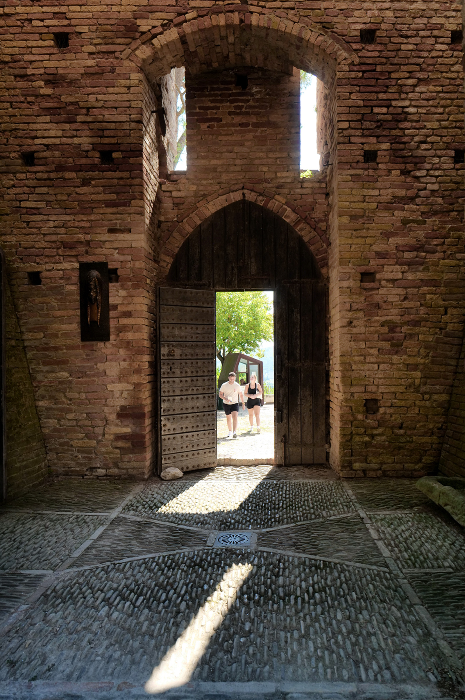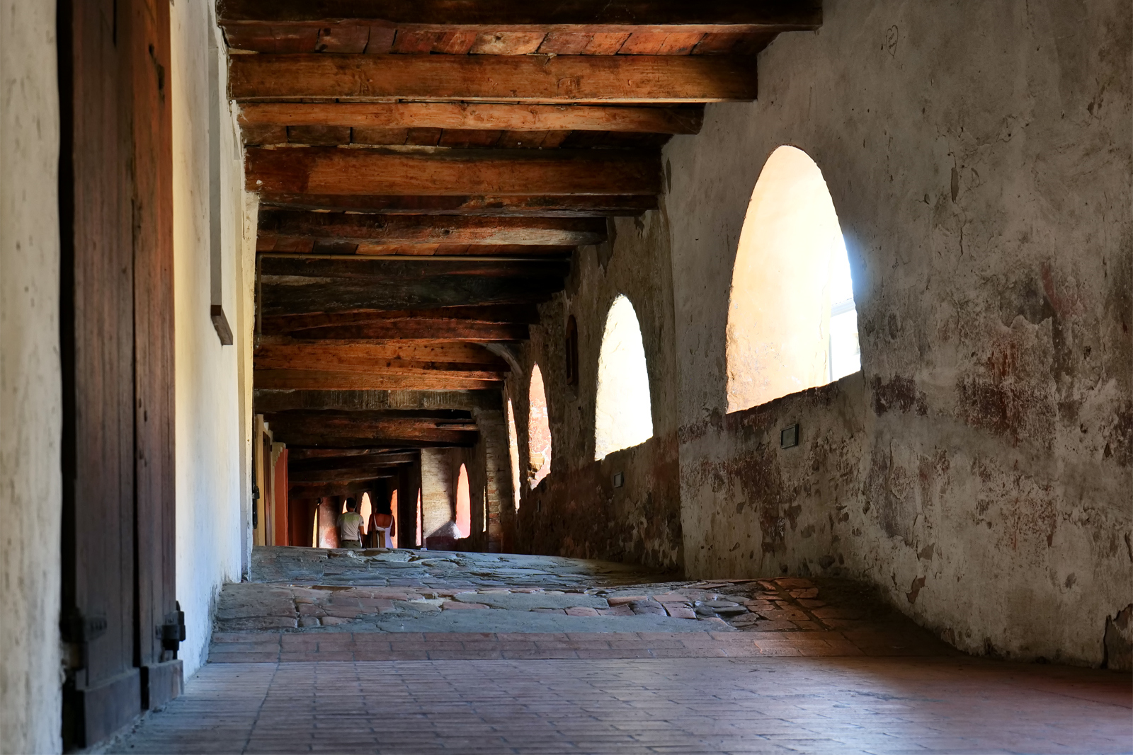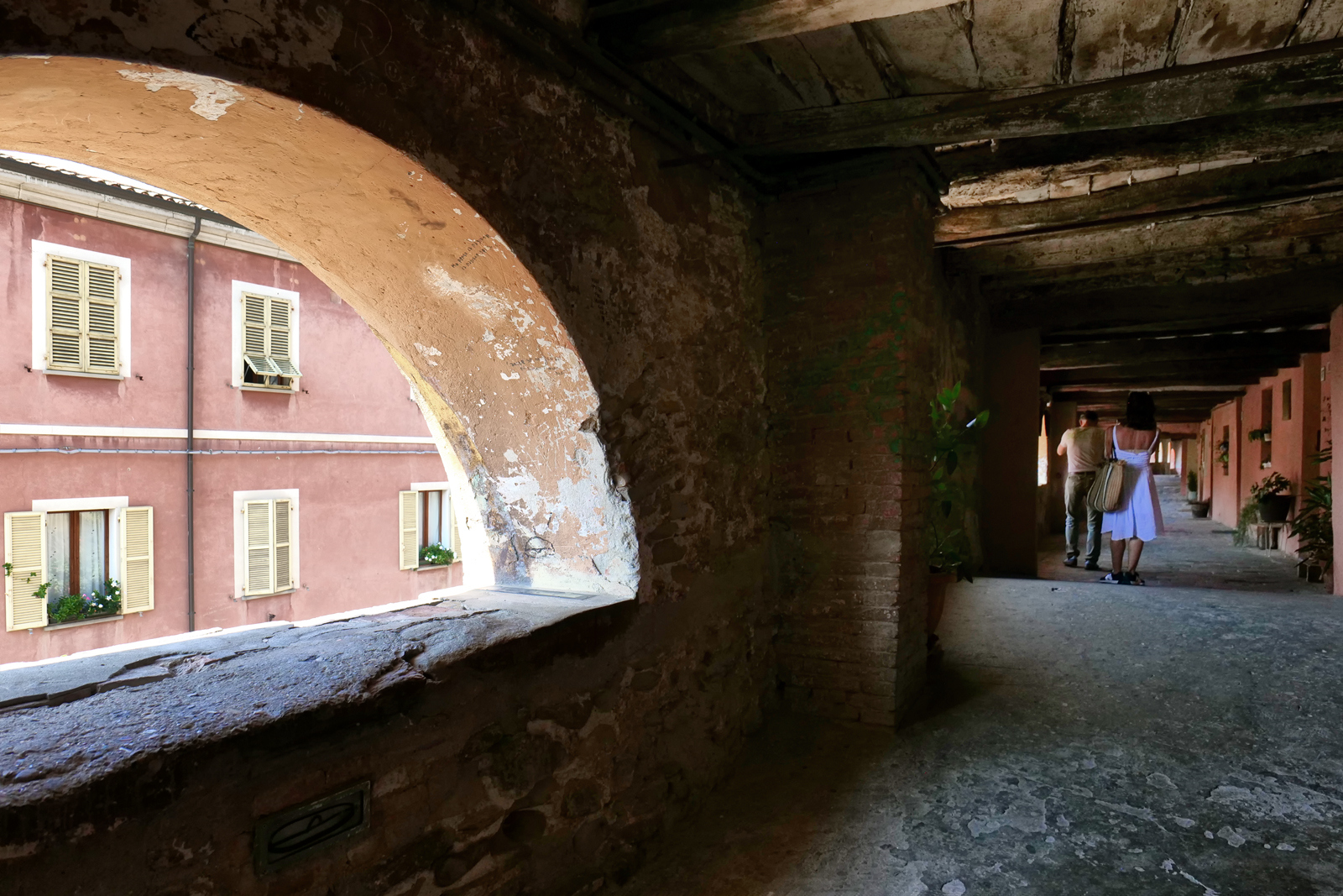 La via del Borgo, nota anche con il nome di via degli Asini, è una suggestiva strada sopraelevata, quasi interamente coperta da archi di ampiezze differenti. Anticamente poggiata su una larga base di roccia, rivestiva un’importante funzione difensiva, attestata dalla presenza di una compatta fila di case a protezione del lato sud del borgo. Solo in un secondo tempo lo zoccolo fu scavato per ricavarne stalle, fondaci e negozi, trasformando così il portico in una sopraelevata. Il nome di via degli Asini deriva dall’uso di far passare per la via le carovane di animali adibiti al trasporto del materiale dalle vicine cave di gesso.